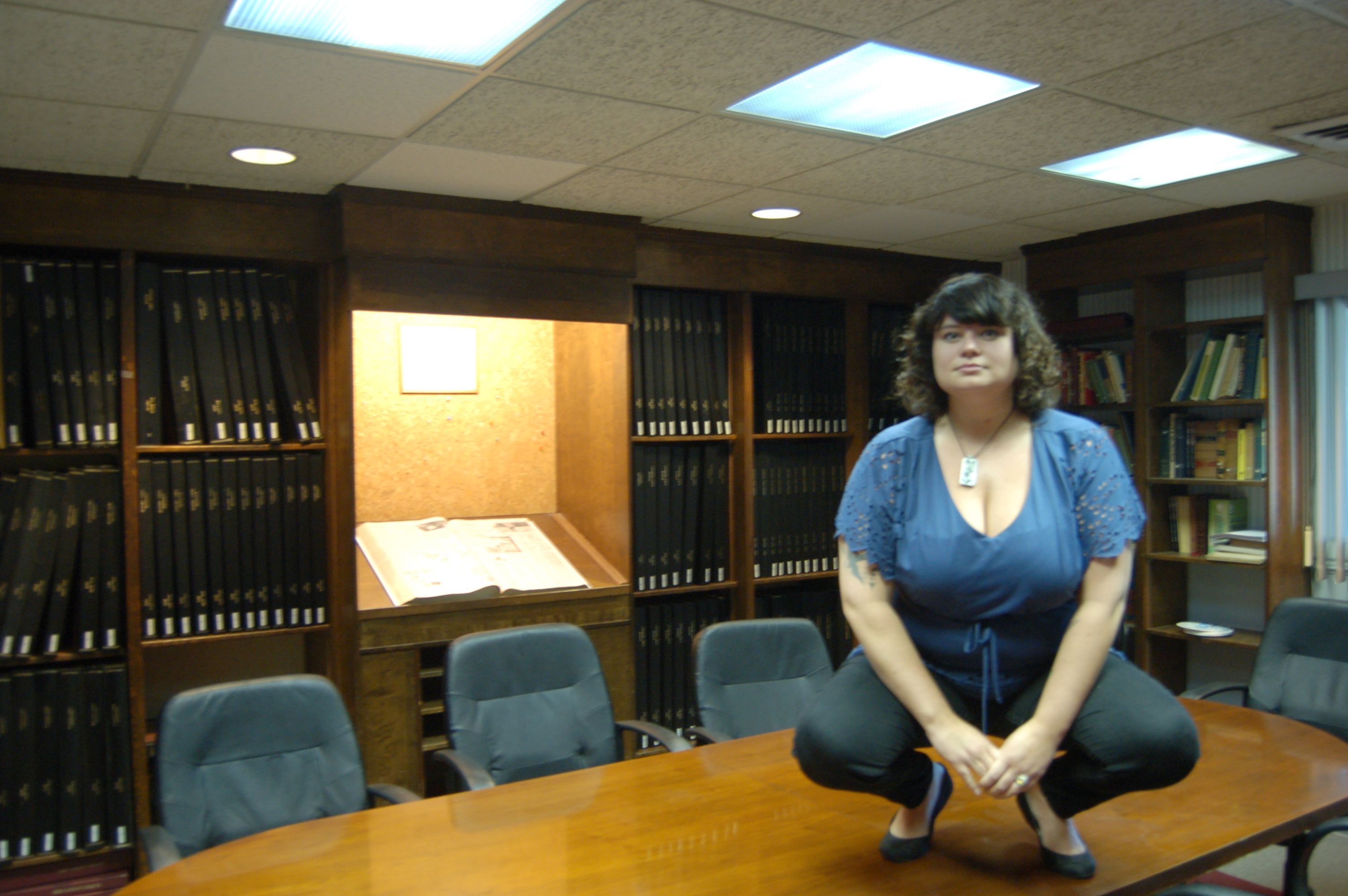 our conference room table. Behind her beckon the Times-Mirror’s 50+ years of