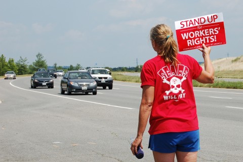 From Massachusetts to Virginia, workers are donning red shirts and carting placards reading, “CWA On Strike For Middle Class Jobs,” in front of Verizon stores, including its campus in Ashburn.